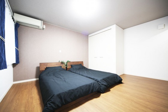 落ち着いた色合いの寝室 2階のご夫婦の寝室は落ち着いた色味でまとめました。 ベッドの横の収納に寝具など大きなものをまとめて収納できます。 |