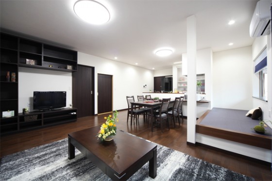 落ち着いたシンプルなコーディネート 造り付けのTVボードなど、全体を落ち着いたダークトーンでまとめたシンプルなコーディネートをご提案しました。 キッチン背面の収納庫には、家電もその中に隠してしまえるようコンセントを設けています。 |