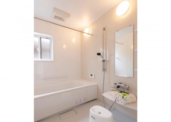 清潔感のあるお風呂に 白を基調とした清潔感のあるお風呂になりました。 手摺りもつけて安全で快適な浴室に。 |