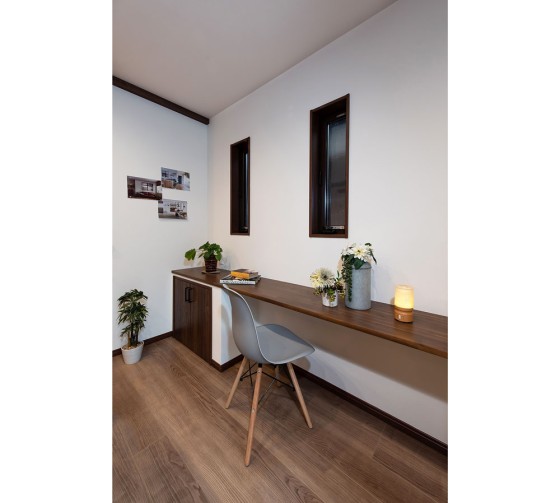 ダイニング横のお仕事スペース ダイニングテーブルとは別にお仕事スペースを造作。 プリンターやシュレッダーをしまう収納も造作しました。 |