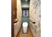 リゾート感あふれるトイレ 奥様こだわりのブルーグリーンの壁紙を正面に貼りました。 楽しくなるようなオシャレなトイレです。 |