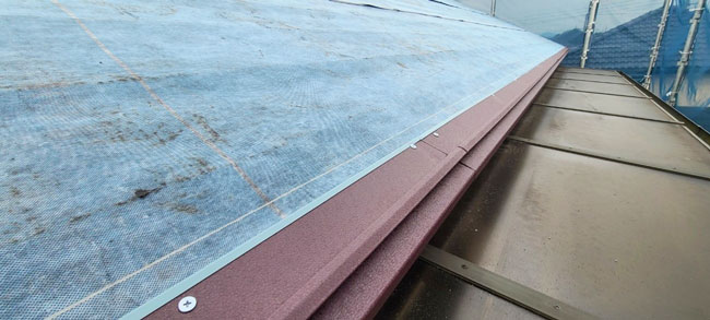 屋根は金属製の仕上げ材を使い、下地防水シート(ルーフィング)を先に既存の屋根材(スレート瓦)に貼って、雨水の侵入を防ぐことで工事の「要」として取り組みました。