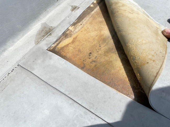 屋根板金の問題② 谷板金:屋根に降った雨の方角を変えて下方に流すための役割がある。谷板金に変形、貫通など劣化が出ると雨漏りになる。