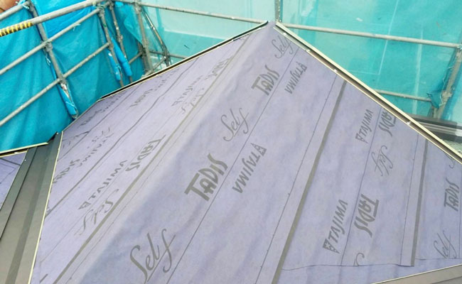 屋根材と下地板の間に張る防水シート(写真は金属製屋根のケース)