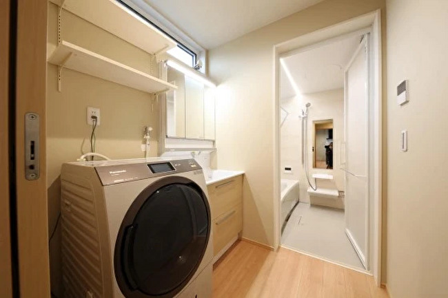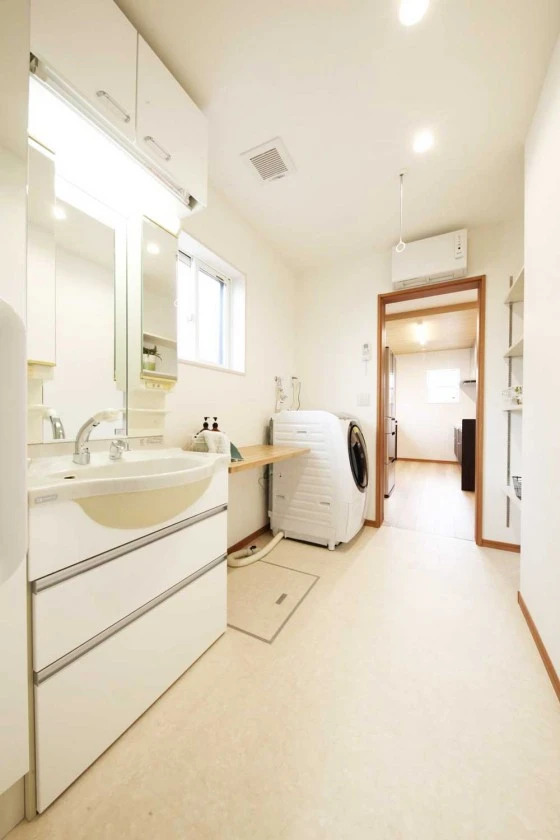 脱衣室としての利用はもちろんのこと、サンルームとしての利用も兼ねており、専用暖房乾燥機を設置し雨でも安心して洗濯でき「洗う、干す、畳む」