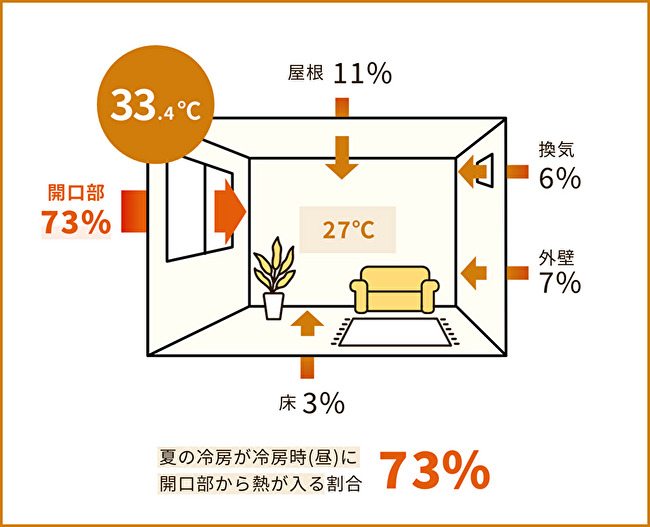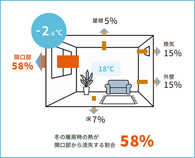 また、窓は住宅全体の外部表面積に占める割合が比較的小さいにもかかわらず、熱の出入りの約58%~73%を担っています。