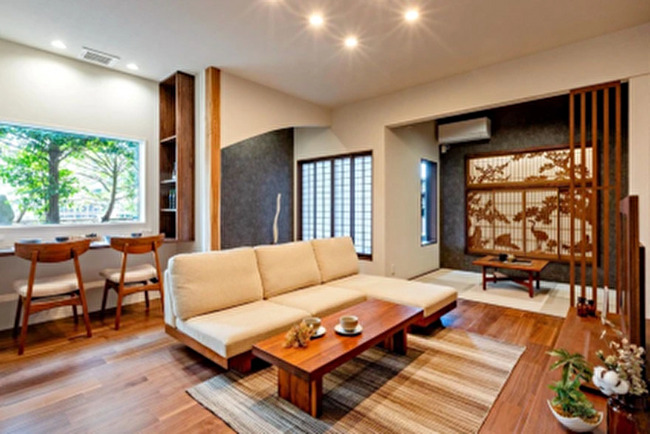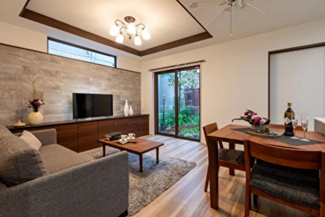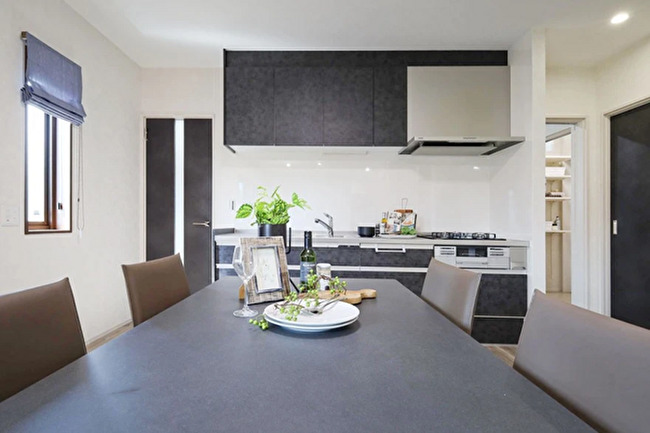 リビング・ダイニングは、ダークトーンの木目とモノトーンでまとめ上げた洗練された空間に。デザイン格子がタタミコーナーとリビングを緩やかに区切り、床材には突板フロアを使用して高級感のある仕上がりとなっています。