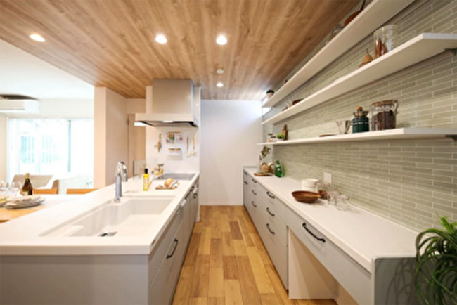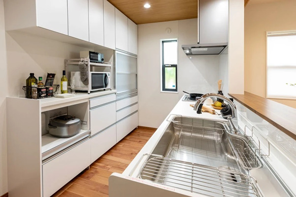 対面キッチンの背面には造作収納を設置し、デザイン性を損なうことなく十分な収納スペースを確保。キッチン周りをすっきりと保つことができます。