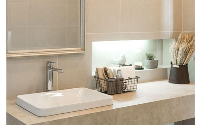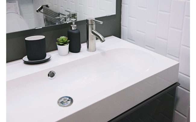 掃除の手間を減らすには、まず形状に注目しましょう。洗面ボウルとカウンターの継ぎ目がない一体成型タイプや、水栓の根元に水が溜まらない壁付け水栓(ハイバックカウンター)は、掃除の手間を減らせます。