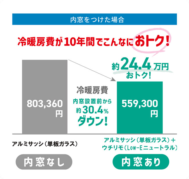 具体的には、内窓を設置することで熱損失を約40~50%削減することが可能です。
