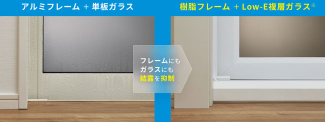 従来のアルミサッシと比較すると、樹脂は熱伝導率が非常に低いため、外気温の影響を受けにくいという特長があります。