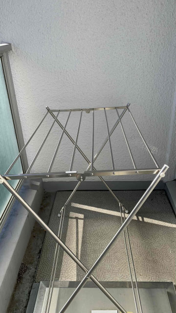 折りたたみ式の物干しラックを取り付けておくと、使わない時に収納できて便利です。