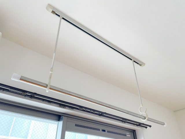 部屋に設置されているダクトレールや天井フックを活用すれば、スマートで見た目にもすっきりした洗濯物の干し方が可能です。
