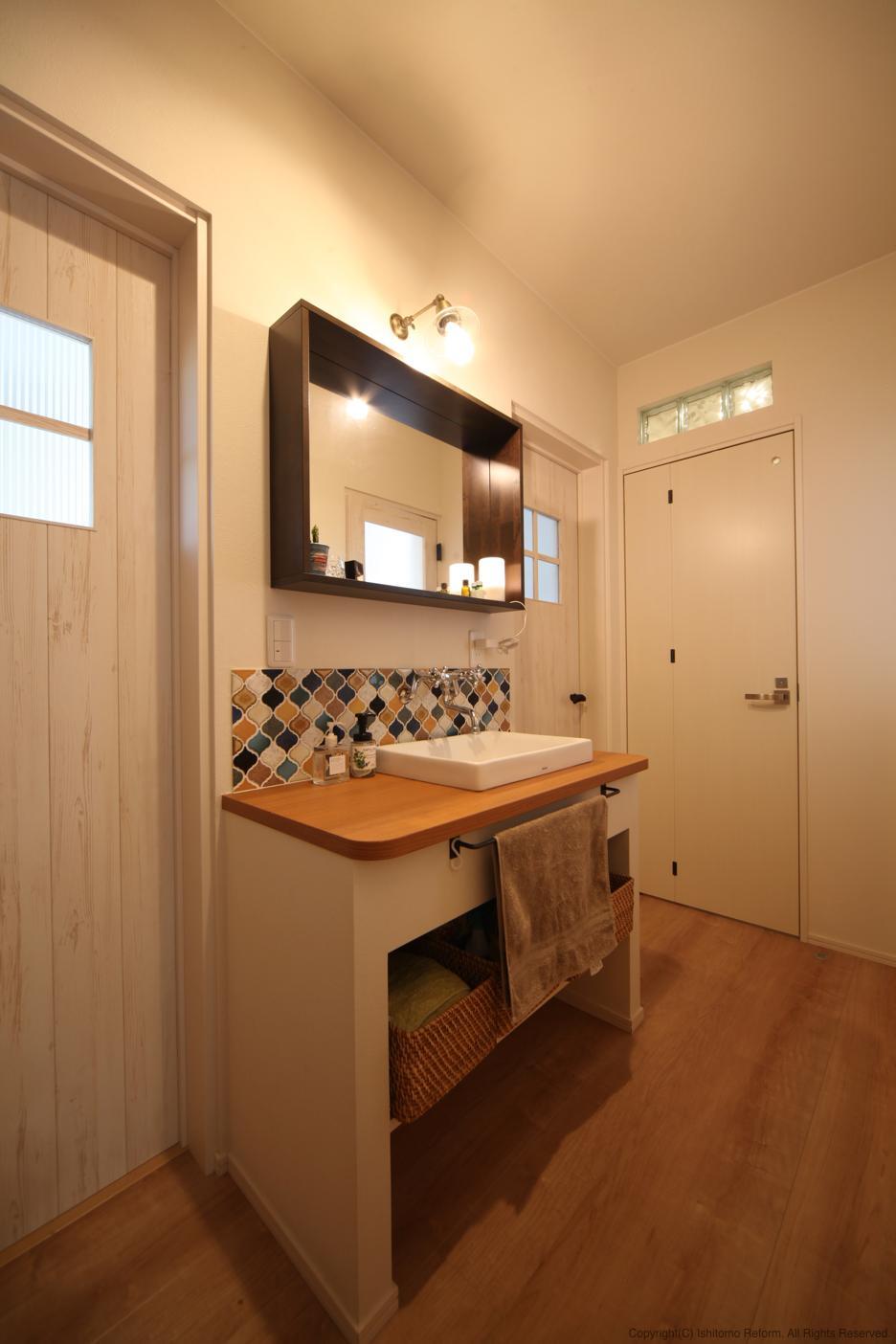 洗面カウンターの上の壁にタイルが貼ってあります。見た目も華やかになりおしゃれになります。