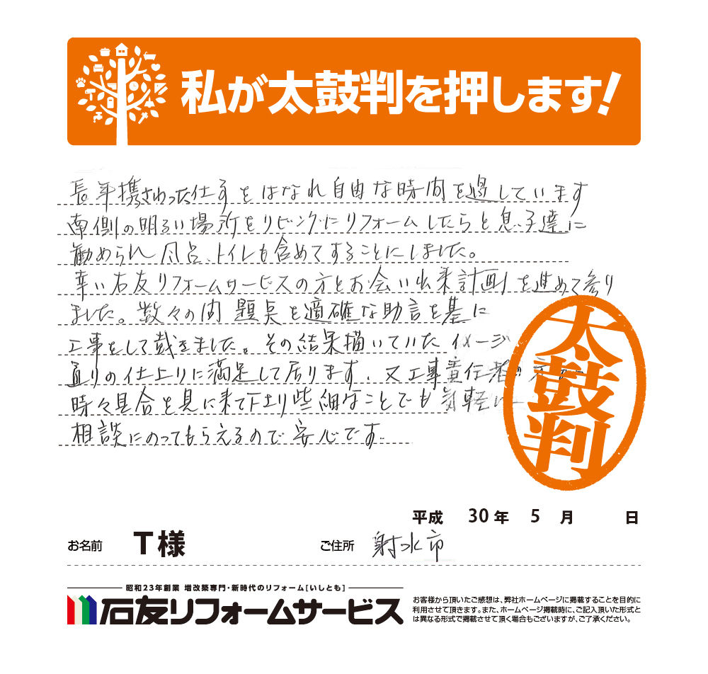 幸い石友リフォームサービスの方とお会い出来計画を進めてまいりました。数々の問題点を的確な助言を基に工事をして戴きました。その結果描いていたイメージ通りの仕上がりに満足して居ります。又、工事責任者の方が時々具合を見に来てくださり些細な事でも気軽に相談にのってもらえるので安心です。