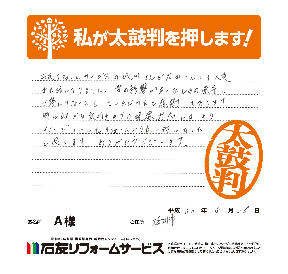 石友リフォームサービスの城川さんと石田さんには大変お世話になりました。雪の影響があったものの素早く丁寧にリフォームをしていただけたと感謝しております。