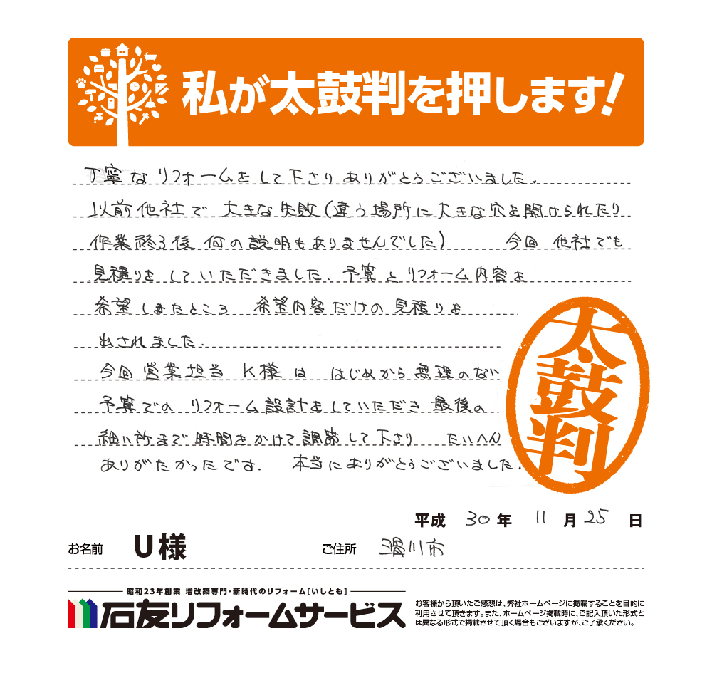 富山県滑川市U様から太鼓判を頂きました!