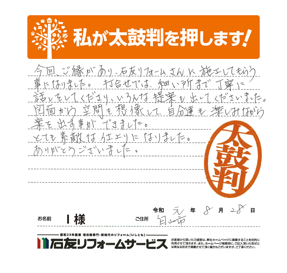 今回、ご縁があり、石友リフォームさんに施工してもらう事になりました。打合せでは、細い所まで丁寧に話しをしてくださり、いろんな提案も出してくださいました。