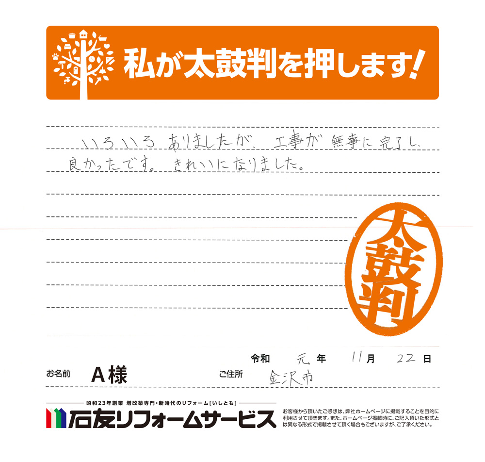 石川県金沢市A様から太鼓判を頂きました!