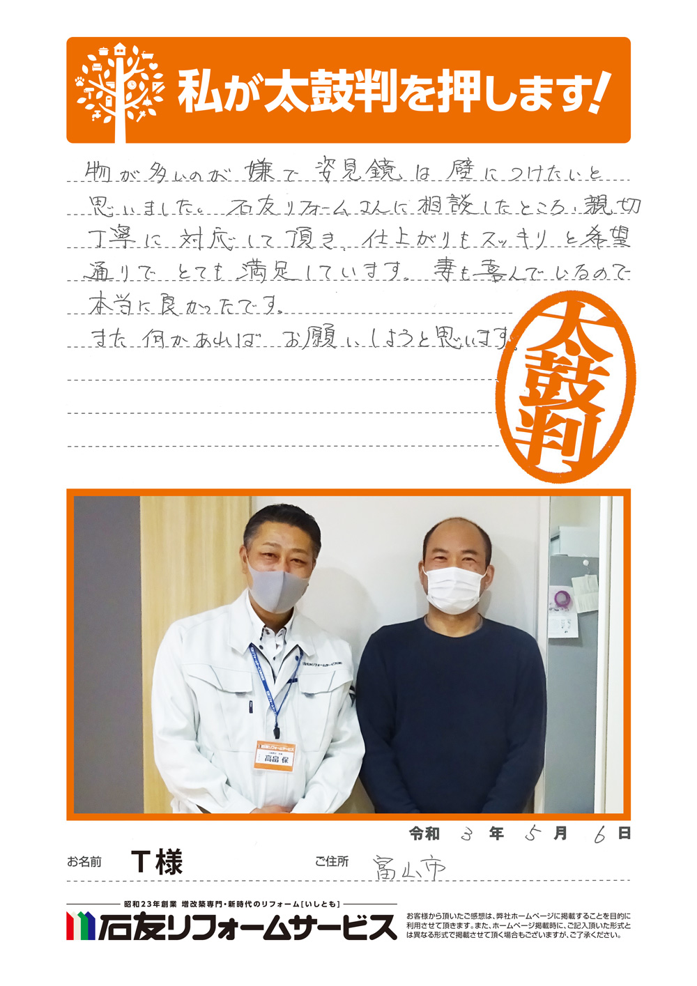 石友リフォームさんに相談したところ、親切丁寧に対応して頂き、仕上がりもスッキリと希望通りで、とても満足しています。