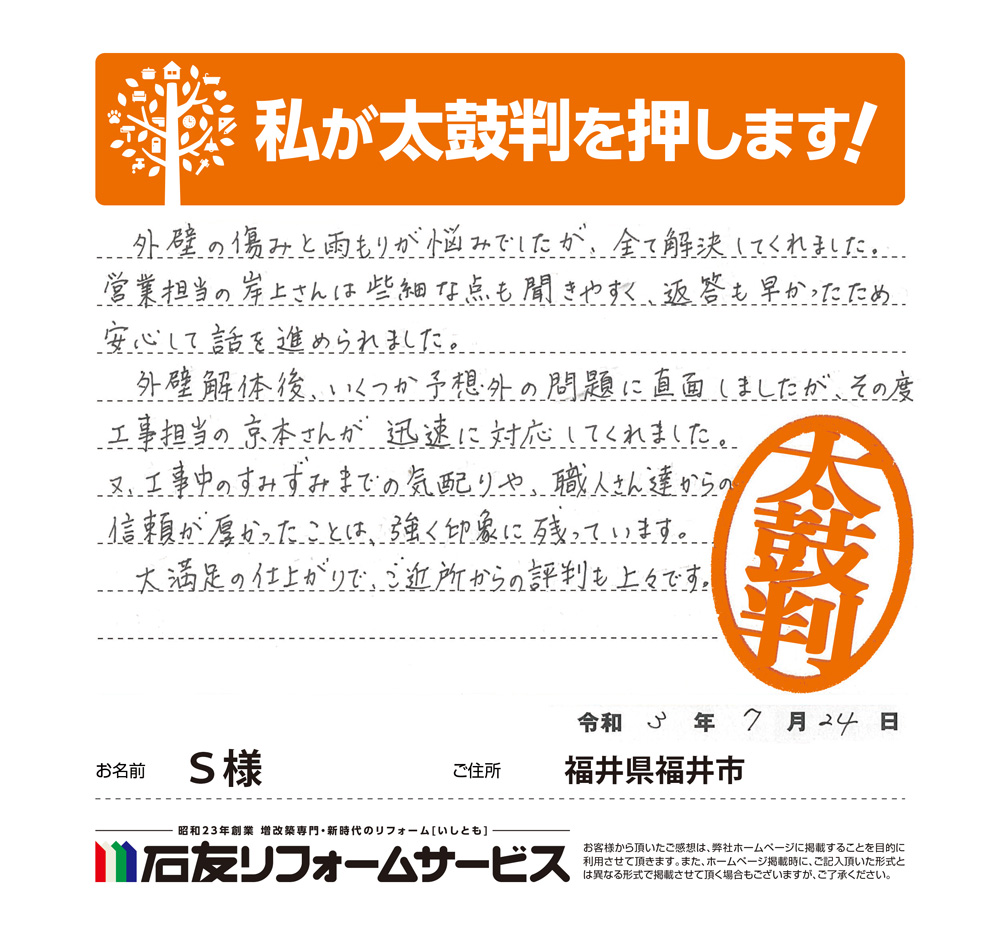 外壁の傷みと雨もりが悩みでしたが、全て解決してくれました。