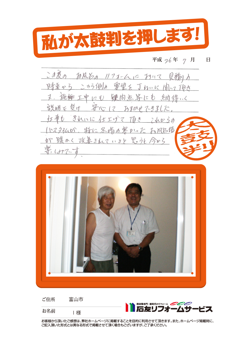 この度のお風呂のリフォームにおいて、見積りの時点からこちら側の要望を丁ねいに聞いて頂き、又、施工中にも疑問点等にも納得いく説明を受け安心しておまかせできました。