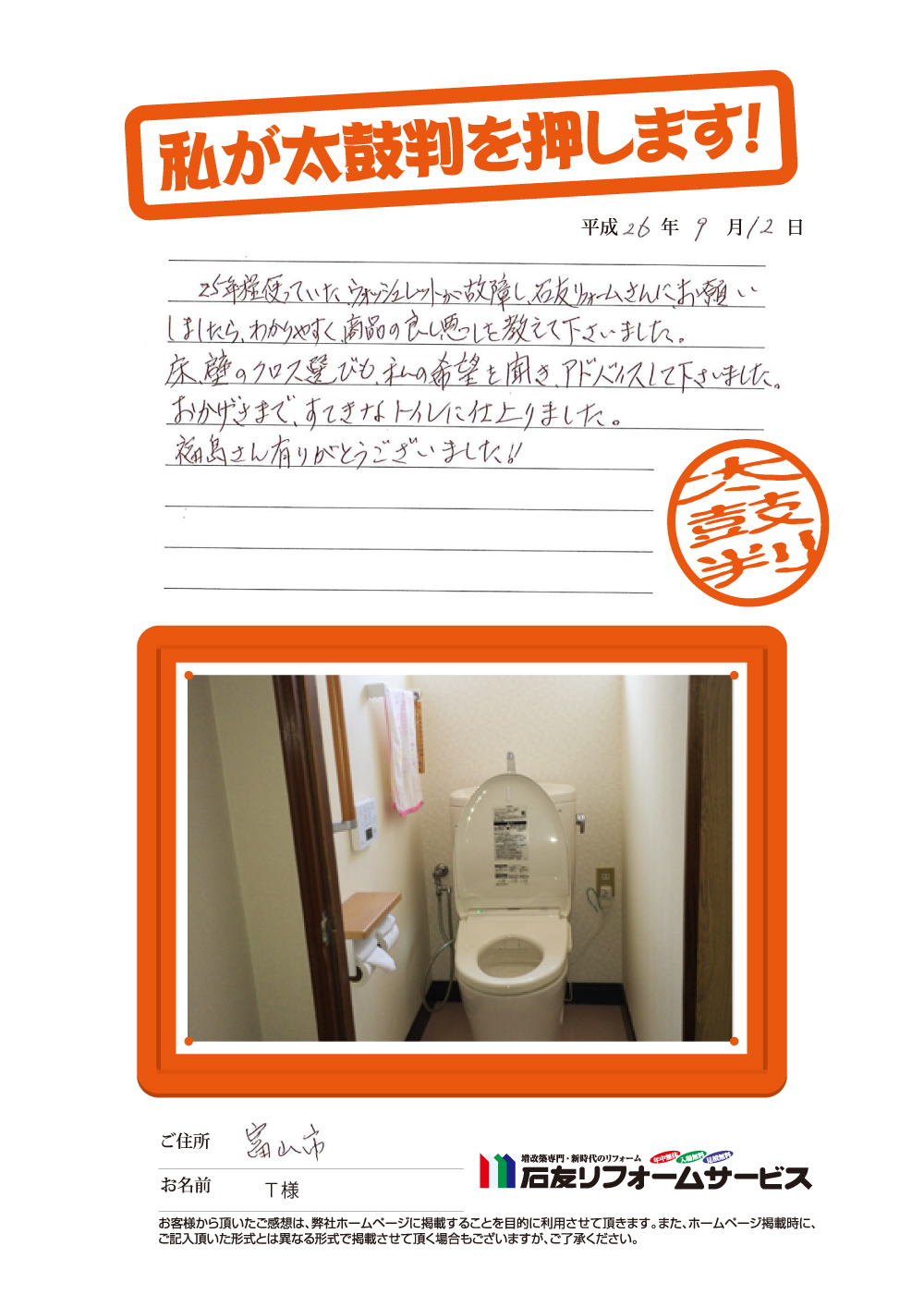 富山県富山市T様から太鼓判を頂きました!