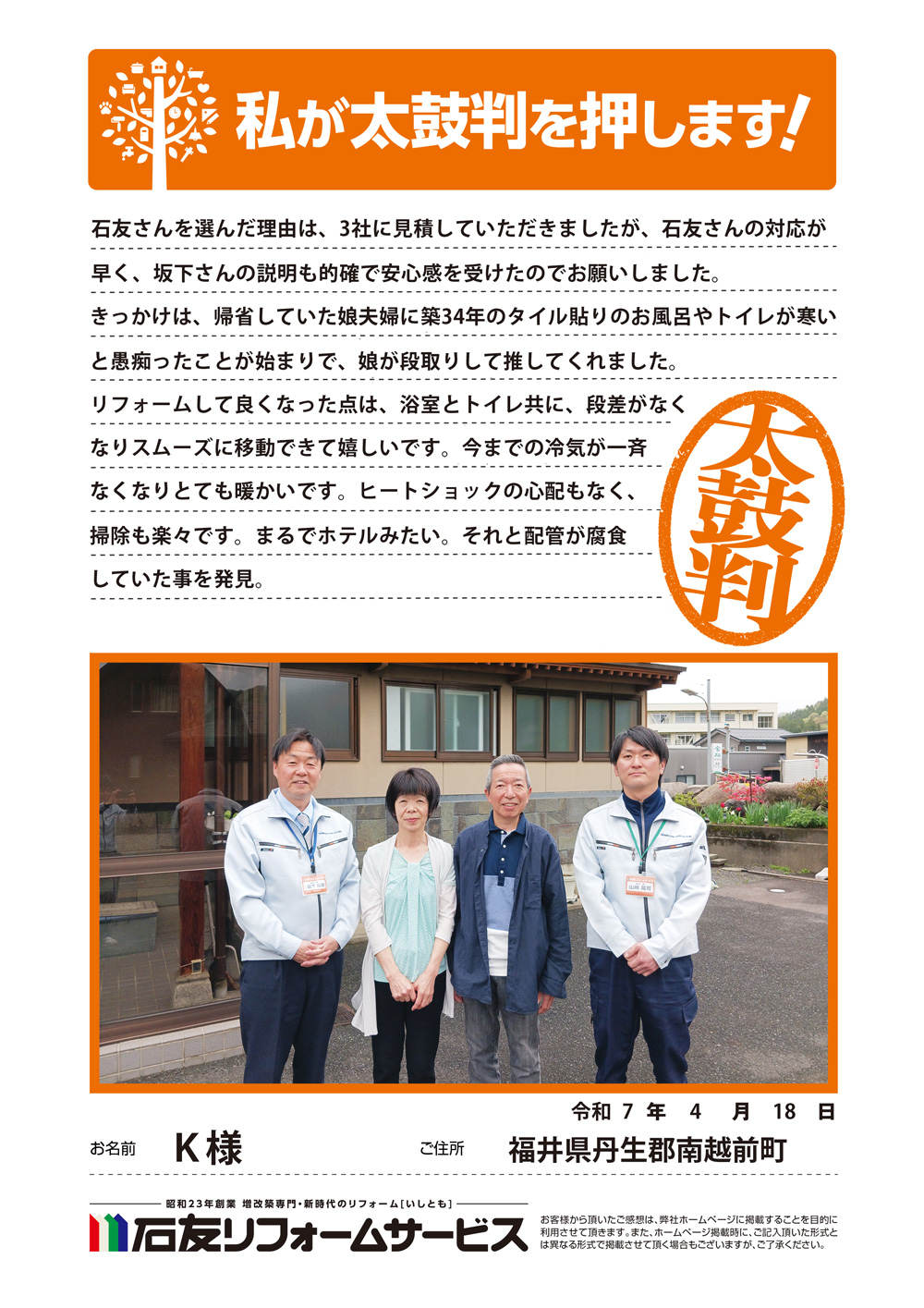 福井県越前町K様から太鼓判を頂きました!
