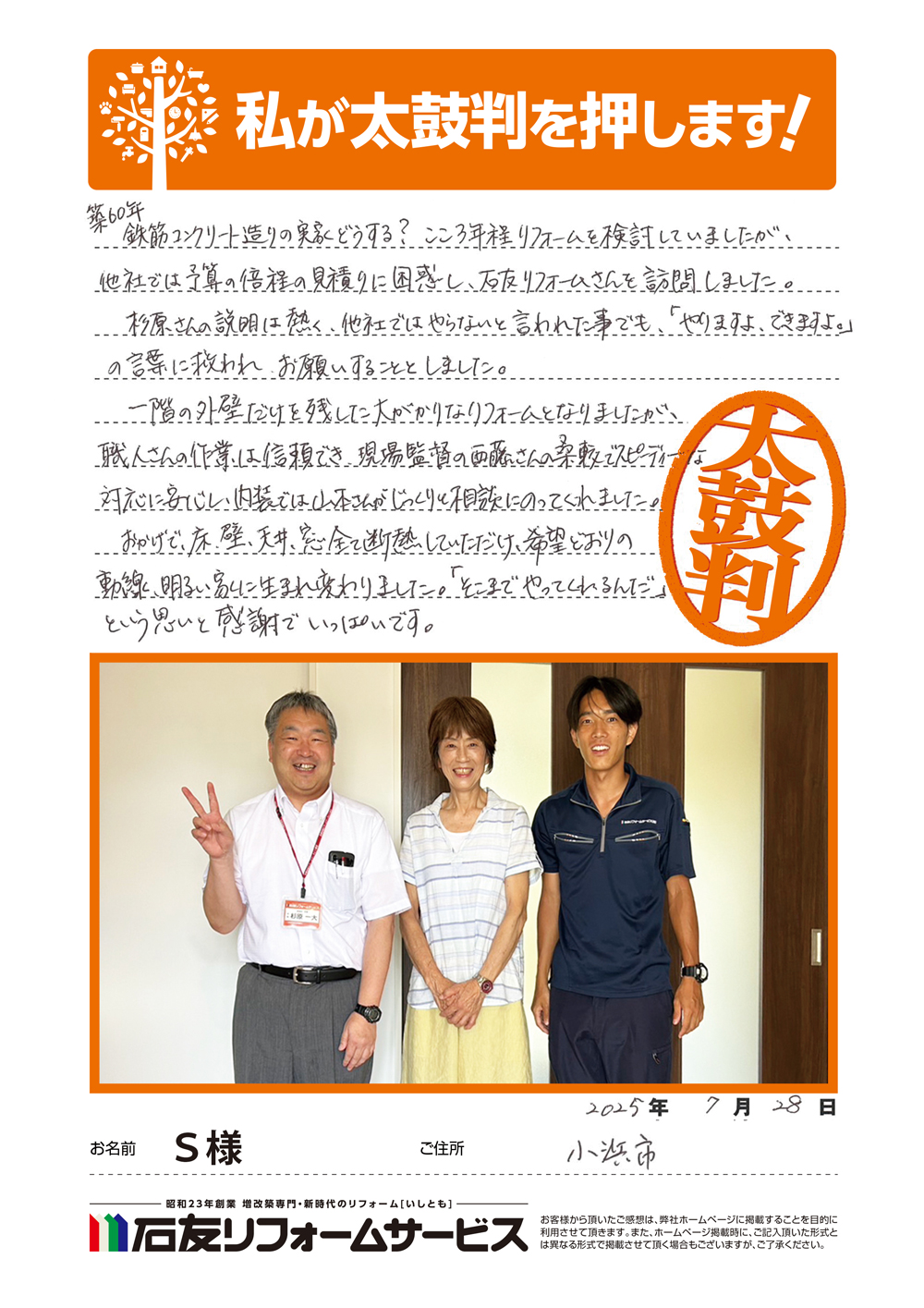 杉原さんの説明は熱く、他社ではやらないと言われた事でも、「やりますよ。できますよ。」の言葉に救われお願いすることとしました。