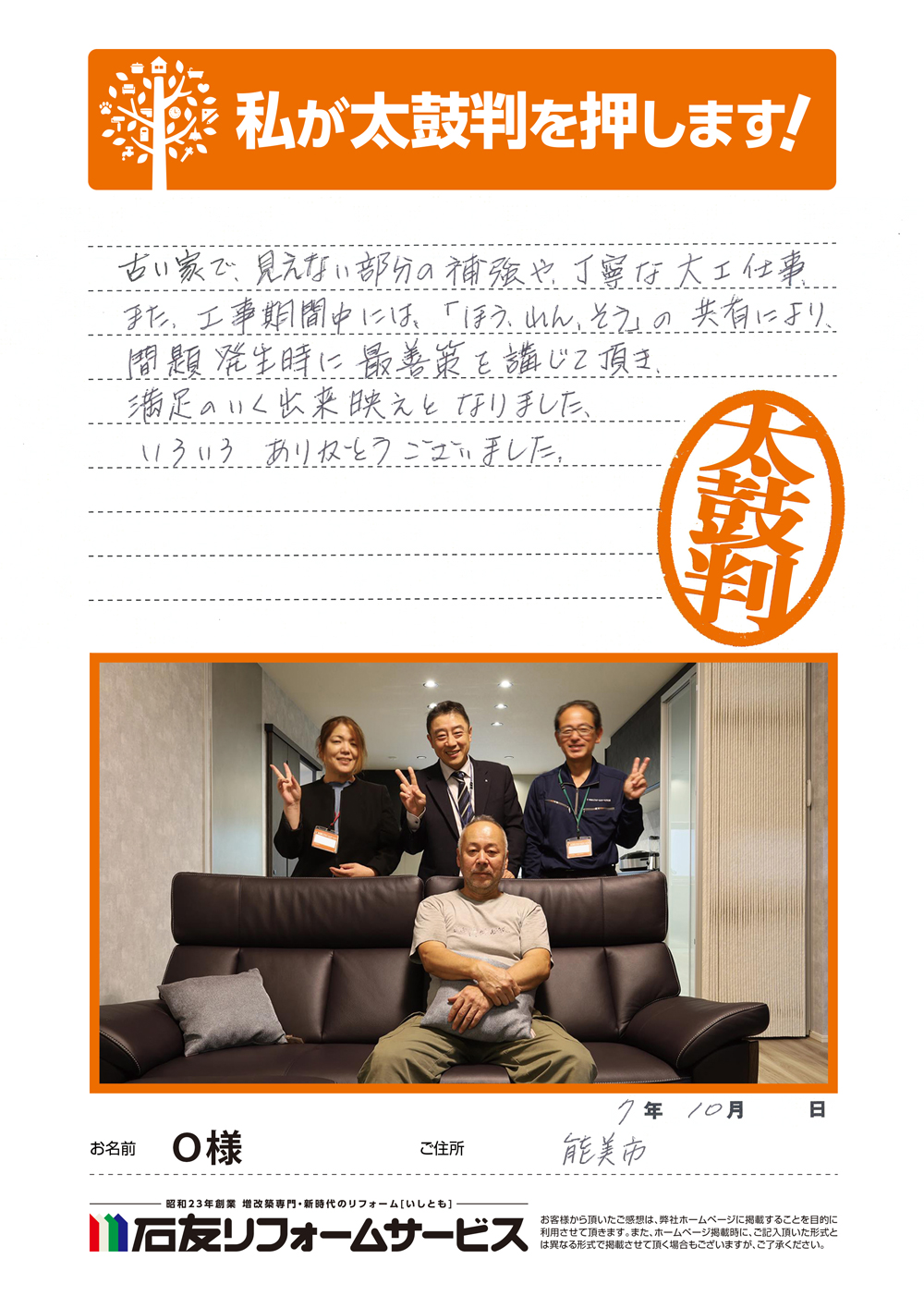 古い家で、見えない部分の補強や丁寧な大工工事。また、工事期間中には「ほう、れん、そう」の共有により、問題発生時に最善策を講じて頂き、