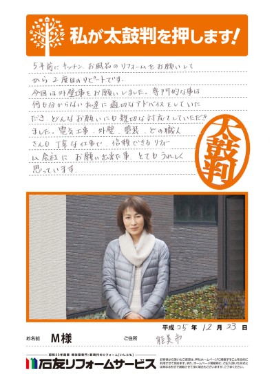 石川県能美市M様から太鼓判を頂きました!