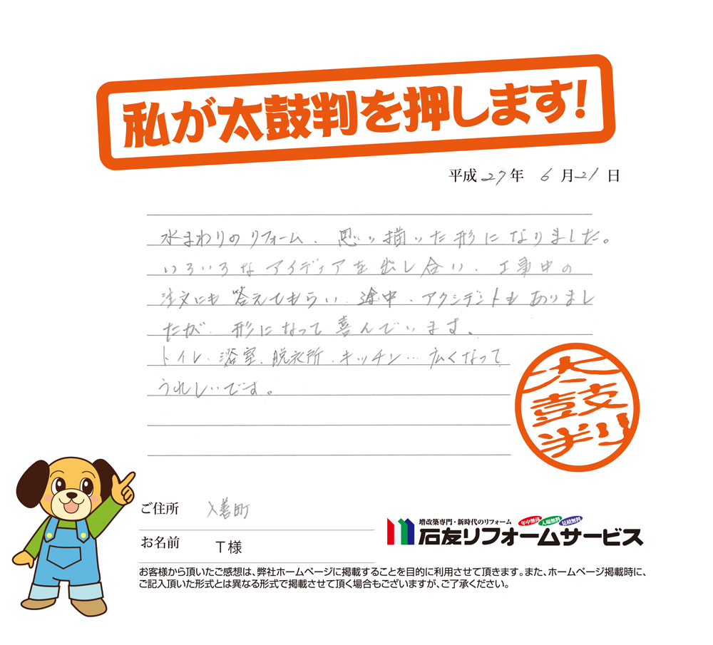 いろいろなアイデアを出し合い、工事中の注文にも答えてもらい途中、アクシデントもありましたが、形になって喜んでいます。