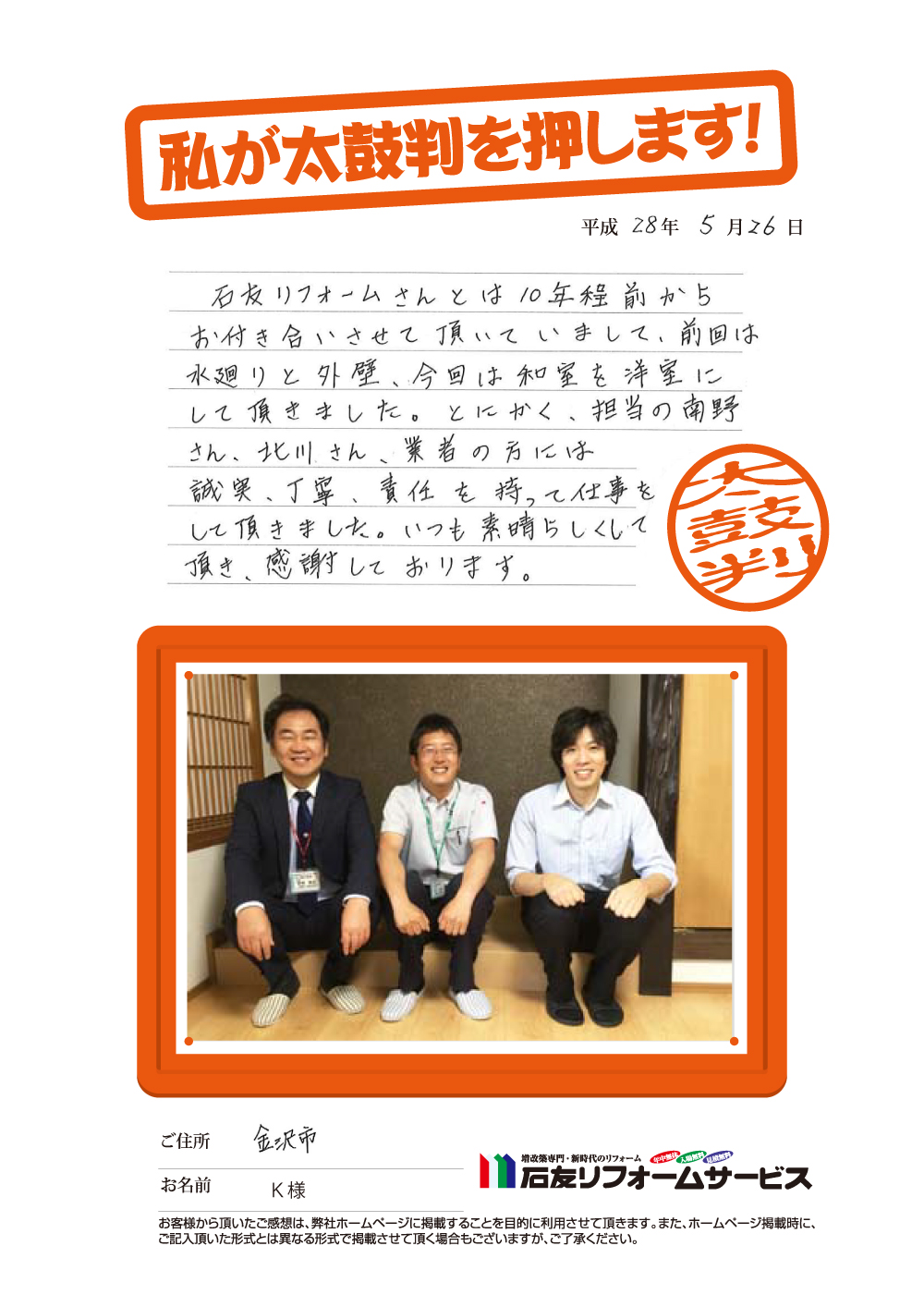 石友リフォームさんとは10年程前からお付き合いさせて頂いていまして、前回は水回りと外壁、今回は和室を洋室にして頂きました。とにかく、担当の南野さん、北川さん、業者の方には誠実、丁寧、責任を持って仕事をして頂きました。いつも素晴しくして頂き、感謝しております。