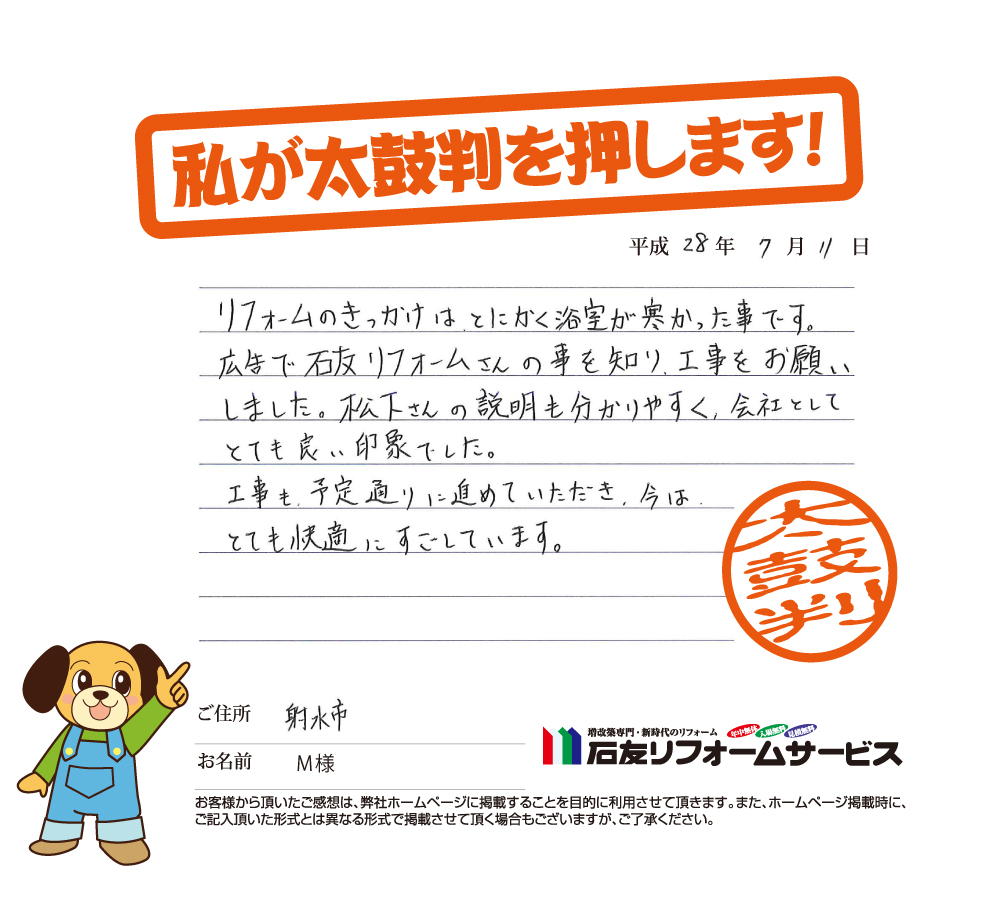 広告で石友リフォームさんの事を知り、工事をお願いしました。松下さんの説明も分かりやすく、会社としてとても良い印象でした。