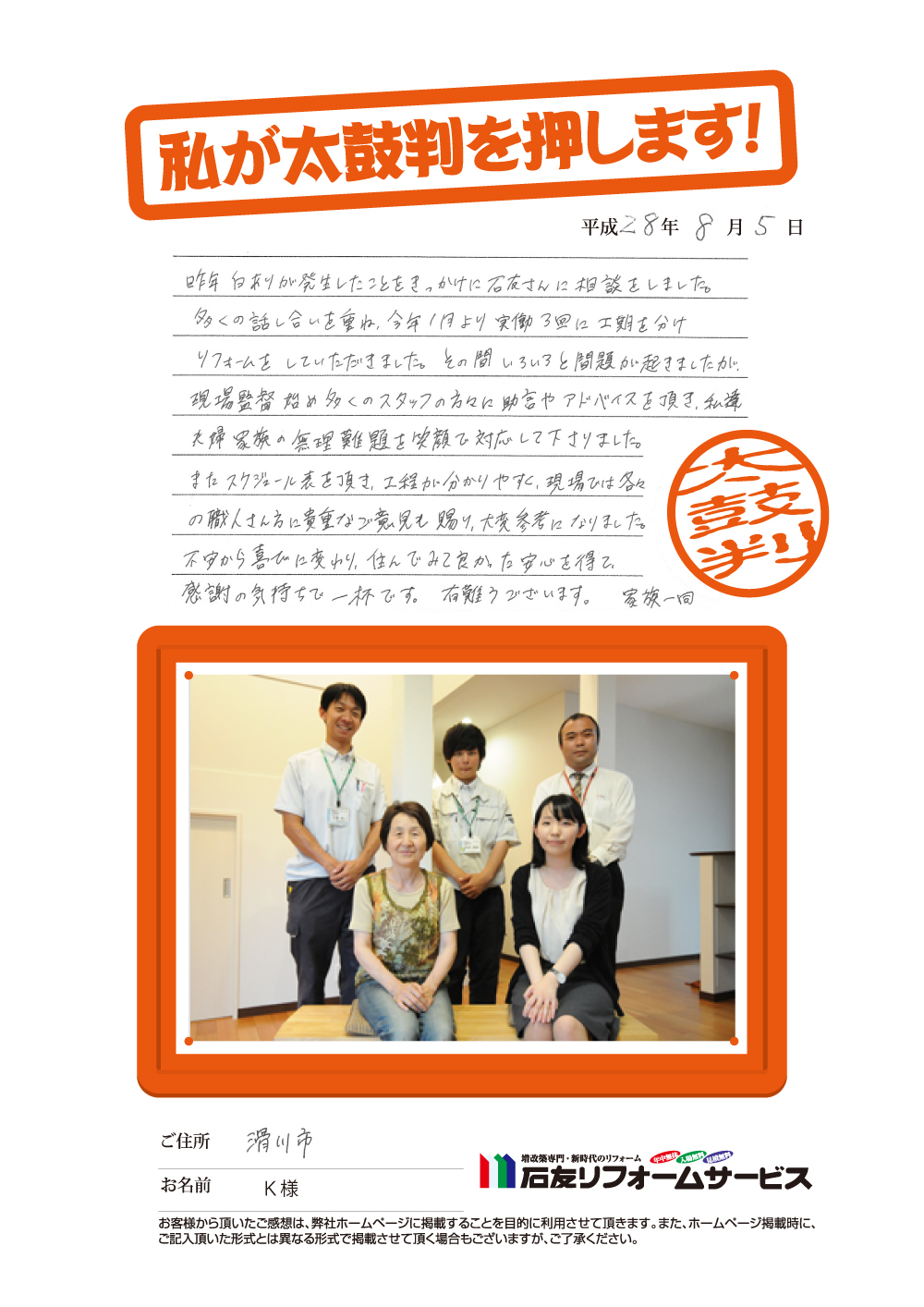 多くの話し合いを重ね、今年1月より実働3回に工期を分けリフォームしていただきました。その間いろいろと問題が起きましたが、現場監督始め多くのスタッフの方々に助言やアドバイスを頂き、私達夫婦家族の無理難題を笑顔で対応して下さりました。