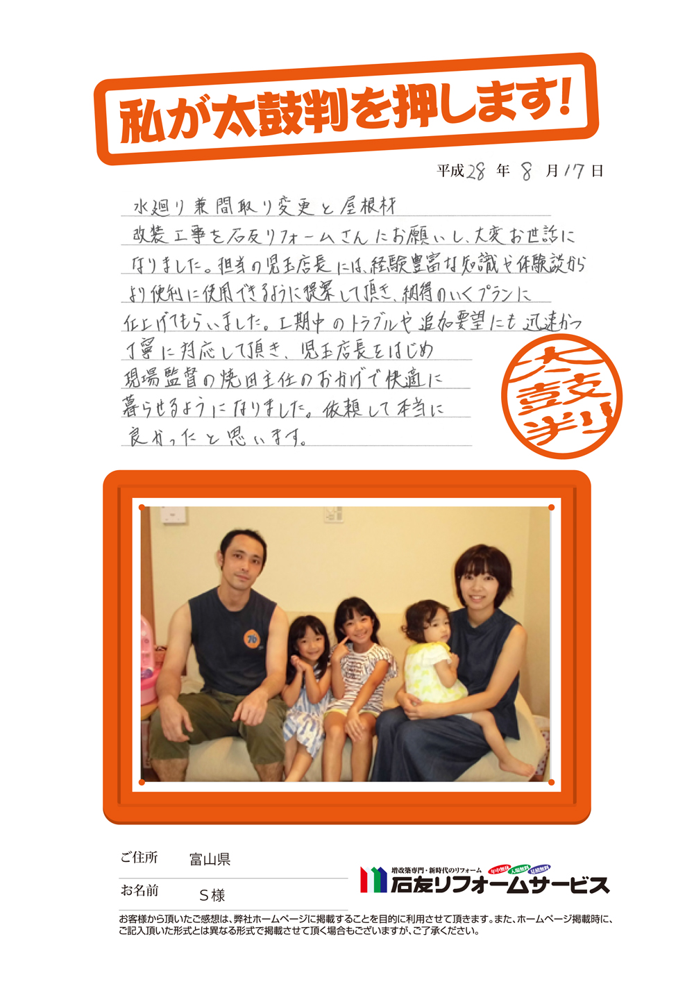 水回り兼間取り変更と屋根材改装工事を石友リフォームさんにお願いし、大変お世話になりました。担当の児玉店長には経験豊富な知識や体験談から、より便利に使用できるように提案して頂き、納得のいくプランに仕上げてもらいました。工期中のトラブルや追加要望にも迅速かつ丁寧に対応して頂き、児玉店長をはじめ現場監督の焼田主任のおかげで快適に暮らせるようになりました。依頼して本当に良かったと思います。