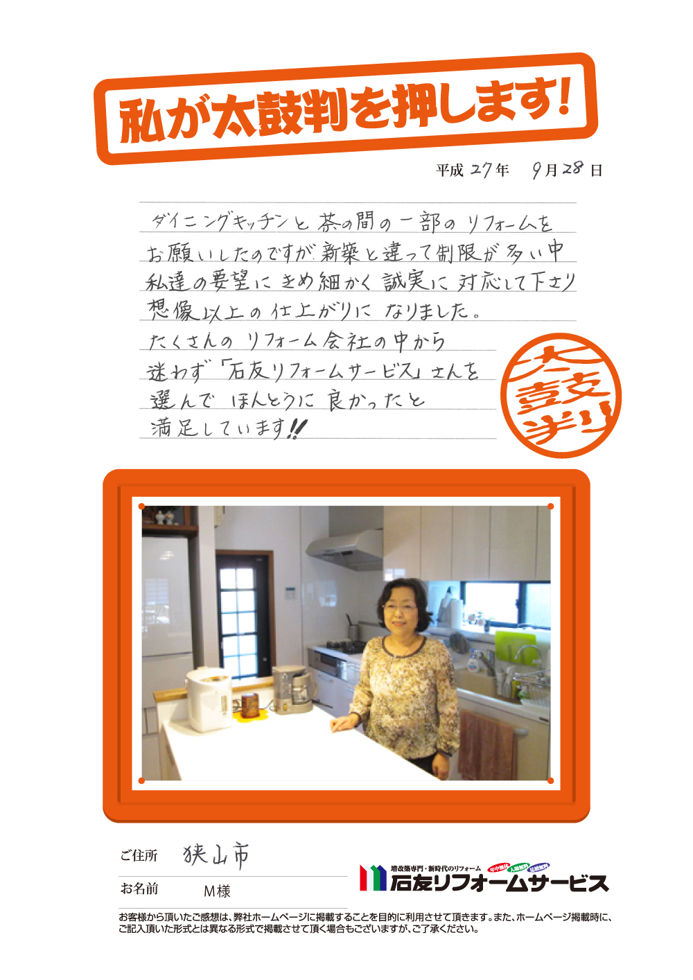 ダイニングキッチンと茶の間の一部のリフォームをお願いしたのですが、新築と違って制限が多い中、私達の要望にきめ細かく誠実に対応して下さり想像以上の仕上がりになりました。たくさんのリフォーム会社の中から迷わず「石友リフォームサービス」さんを選んでほんとうに良かったと満足しています!!