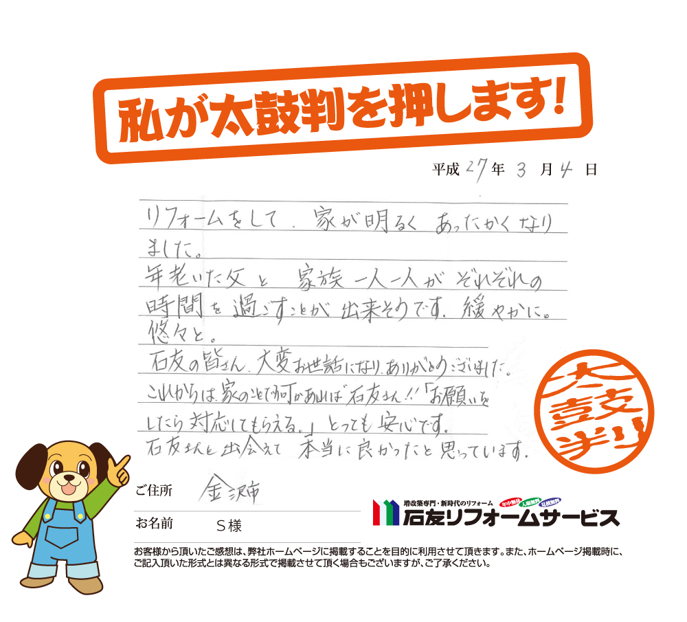これからは家のことで何かあれば石友さん!!「お願いをしたら対応してもらえる。」とっても安心です。