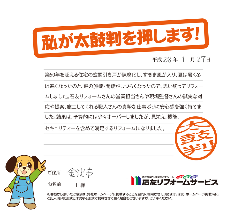 築50年を超える住宅の玄関引き戸が陳腐化し、すきま風が入り、夏は暑く冬は寒くなったのと、鍵の施錠・開錠がしづらくなったので、思いきってリフォームしました。石友リフォームさんの営業担当や現場監督さんの誠実な対応や提案、施工してくれる職人さんの真摯な仕事ぶりに安心感を強く持てました。結果は、予算的には多少オーバーしましたが、見栄え、機能、セキュリティーを含めて満足するリフォームになりました。