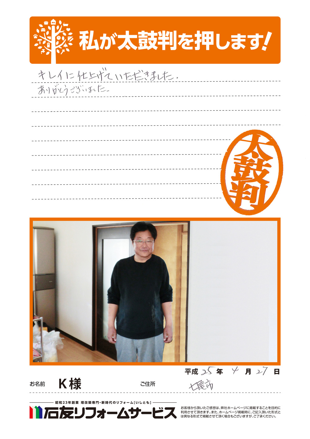 石川県七尾市K様から太鼓判を頂きました!
