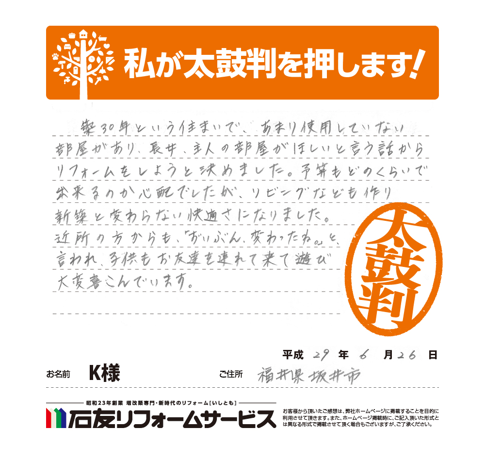 近所の方からも「ずいぶん変わったね。」と言われ子供もお友達を連れて来て遊び大変喜んでいます。