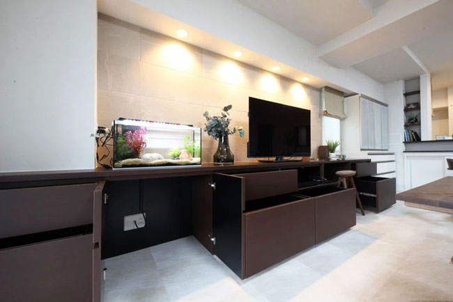 車イスに座っていても、リビング・ダイニング・キッチンのどこにいても家族みんながテレビを観やすい高さに造作でテレビボードを作りました。 リビングにワークスペースを希望されていたこともあり、テレビボード一体型のデスクワークカウンターをご提案しました。 引き出し収納は、A4サイズが入るように設計し、収納量もたっぷり。 趣味の熱帯魚の水槽も鑑賞できるように製作しました。