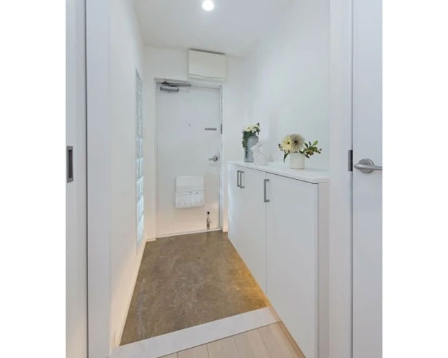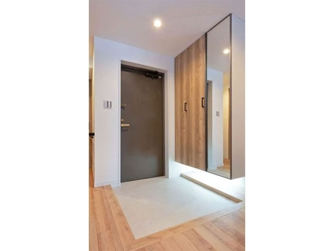 収納不足を解消したいとご要望をいただきました。透明感のあるストーン柄のフロアタイルを貼り、高級感のある玄関になりました。