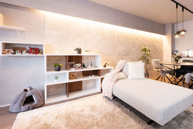 インテリアには落ち着きのあるベージュやグレーを基調とし、壁面には大柄のエコカラットを採用。優雅で洗練された印象を与えています。 可愛い猫ちゃんのために、キャットウォークを取り付けました。