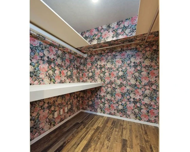 お嬢様のご要望でR壁のオープンクローゼットを造作。中のクロスの花柄がポイントです。