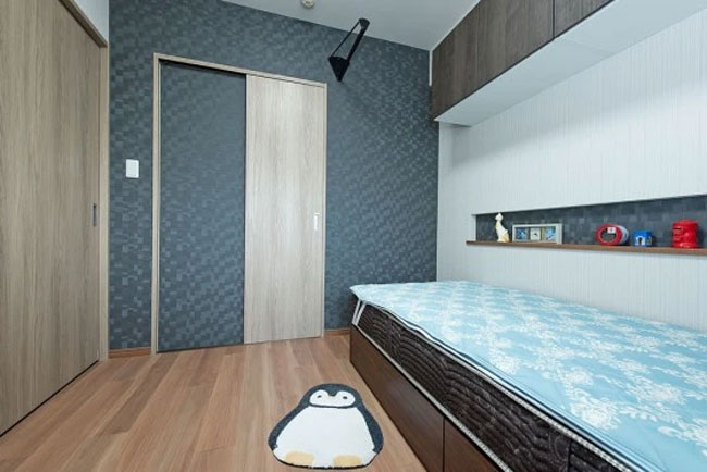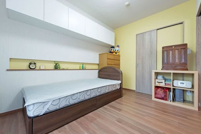 奥様の寝室と息子さんの部屋は個別の収納をなくしてしまったため、邪魔にならないよう吊戸棚を設置しました。
