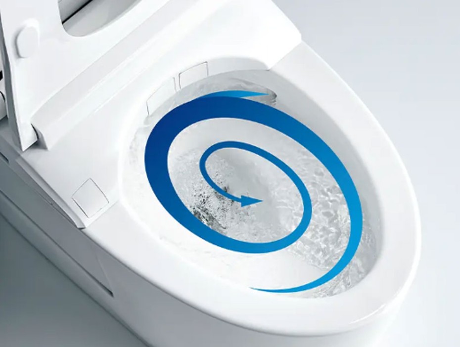 便器奥の吐水口より水流を勢いよく噴出、旋回流で便器全体をぐるりと効率よく洗い流すので、しつこい汚れもしっかり洗い流します。