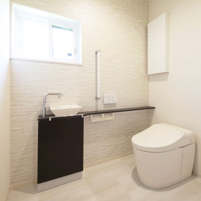 足腰に不安を抱えていらっしゃったご主人様は、最初から車椅子ありきのプランでご希望。 トイレの入口は片引き戸にしてスムーズに出入りできるように。 壁埋め込みの収納も設けて、爽やかながら高級感も出る空間に仕上げました。