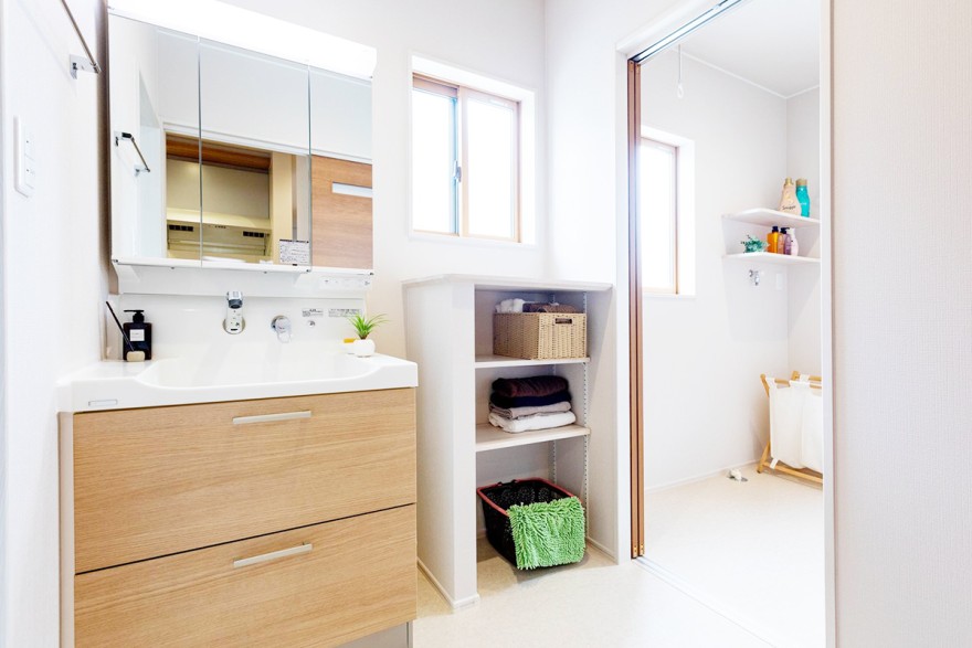 脱衣横にはサンルームを。北陸では必要不可欠です。適所に窓を設け明るさと風通しにも配慮。洗面台の横は着替えやタオル、脱衣かごが仕舞えるカウンター棚を設置。脱衣スペースと洗濯スペースを分けスッキリしました。