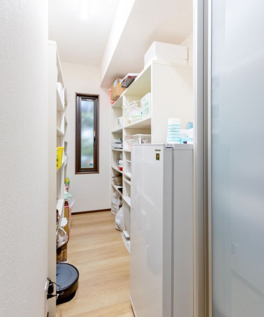 キッチン回りをセンス良く、いつでもキレイに見せるために、キッチンの裏側には大容量の食器棚と可動式のパントリーを設けました。 保存食からキッチン用品まで、たっぷりと収納できるこの空間により、いつでもキレイなキッチン回りを保てます。